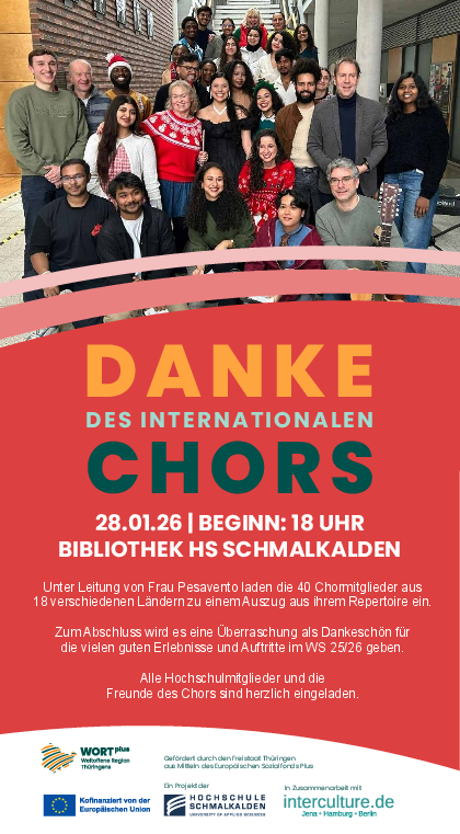 Daher laden wir Sie herzlich zur Veranstaltung: „Danke des Internationalen Hochschulchors“ am 28. Januar 2026 in die Bibliothek der Hochschule Schmalkalden ein.