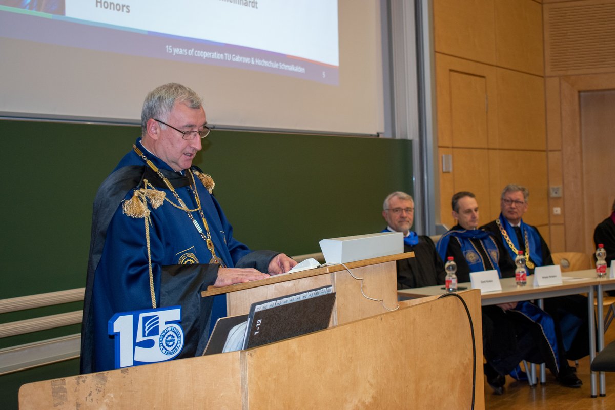 Hochschulpräsident Prof. Gundolf Baier hob in seiner Ansprache hervor, dass die Freundschaft zwischen den Hochschulen letztlich auf der Freundschaft zwischen den Menschen beruhe. Er würdigte ganz besonders die Personen, die von der ersten Stunde an die Kooperation begleiteten und über die vielen Jahre auch entscheidend prägten. Dazu zählten Prof. Joachim Bach von der Hochschule Schmalkalden und Assist. Prof. Svetlana Panayotova, die die Kooperation begründeten. Aber auch Prof. Jürgen Gemeinhardt pflegte mit zahlreichen Besuchen die Partnerschaft über all die Jahre. Auch Prof. Iliya Zhelezarov, Rektor der TU Gabrovo, betonte in seinem Grußwort, wie wichtig diese Partnerschaft für seine Hochschule sei. „Seit vielen Jahren nehmen regelmäßig unsere Studierenden und Dozenten an der International Engineering Week in Schmalkalden teil“, so Zhelezarov. Auch frühere Weggefährten wie Alt-Rektor Prof. Elmar Heinemann waren beim Festakt dabei und sprachen ein Grußwort. „Unsere Partnerschaft fiel in den Beginn meiner Zeit als Rektor“, erinnerte sich Heinemann. Bei seinen Aufenthalten in Gabrovo habe er viele Kollegen persönlich kennengelernt und die große Gastfreundschaft der Bulgaren genossen. Ein Höhepunkt dieser Partnerschaft war schließlich die Ehrendoktorwürde, die die Technische Universität Gabrovo ihm im Jahr 2018 verliehen habe.