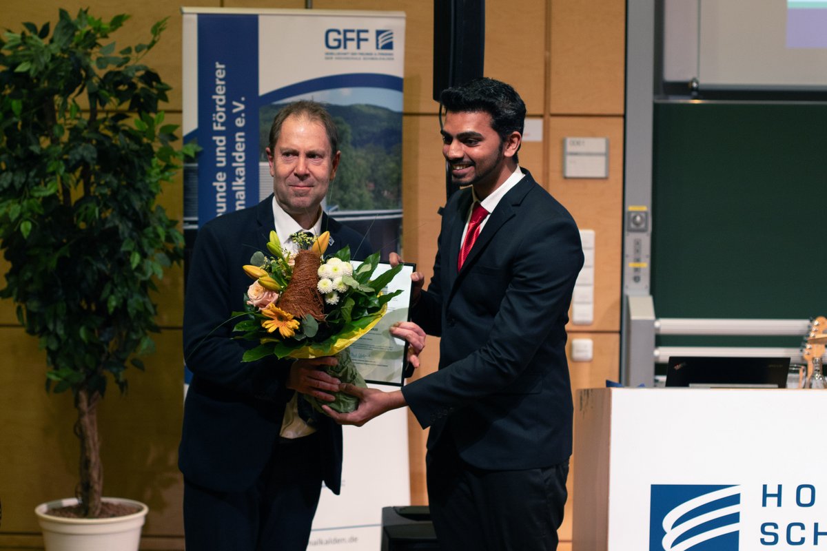 Ein weiterer Förderpreis wurde durch die Stadt Schmalkalden an Jayadeep Raj für seine Arbeit zum Thema: „Harnessing the potential of generative AI tools in the design and prototyping paradigm of exoskeleton arms” vergeben. Diese wurde durch Prof. Frank Schrödel betreut und mit einer 1,7 bewertet.