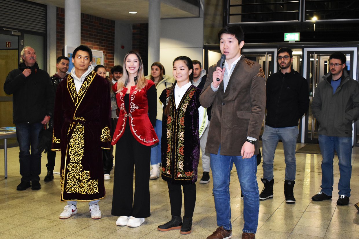 Kasachstan – das weltweit neuntgrößte Land in Zentralasien – war gestern Abend Themenschwerpunkt zum ersten Kazakh Day an der Hochschule Schmalkalden. Der Abend bot ein buntes Rahmenprogramm mit viel Hintergrundwissen zum Land: An einzelnen Ständen konnten sich die Gäste über Land und Leute und die Deutsch-Kasachische Universität (DKU) informieren. Typische kulinarische Köstlichkeiten wie Baursaki - kleine frittierte Teigbällchen – mit einem Glas Stutenmilch konnten vor der offiziellen Begrüßung durch Prof. Heinz-Peter Höller und Hochschulpräsident Prof. Gundolf Baier probiert werden. Die Veranstaltung wurde durch das Projektteam der Deutsch-Kasachischen Universität organisiert, das an der Fakultät Informatik der Hochschule Schmalkalden angesiedelt ist. Nach der Begrüßung luden die Organisatoren zum gemeinsamen Abendessen ein: Aufgetischt wurde Plov - eine kasachische Reispfanne, zubereitet durch die Mensa Schmalkalden. Im Anschluss an das Abendessen führten kasachische Studierende durch ein unterhaltsames Showprogramm mit Folkloretänzen, Schauspiel und einem Länderquiz. Ein rundum unterhaltsamer Abend, der Lust auf mehr macht.