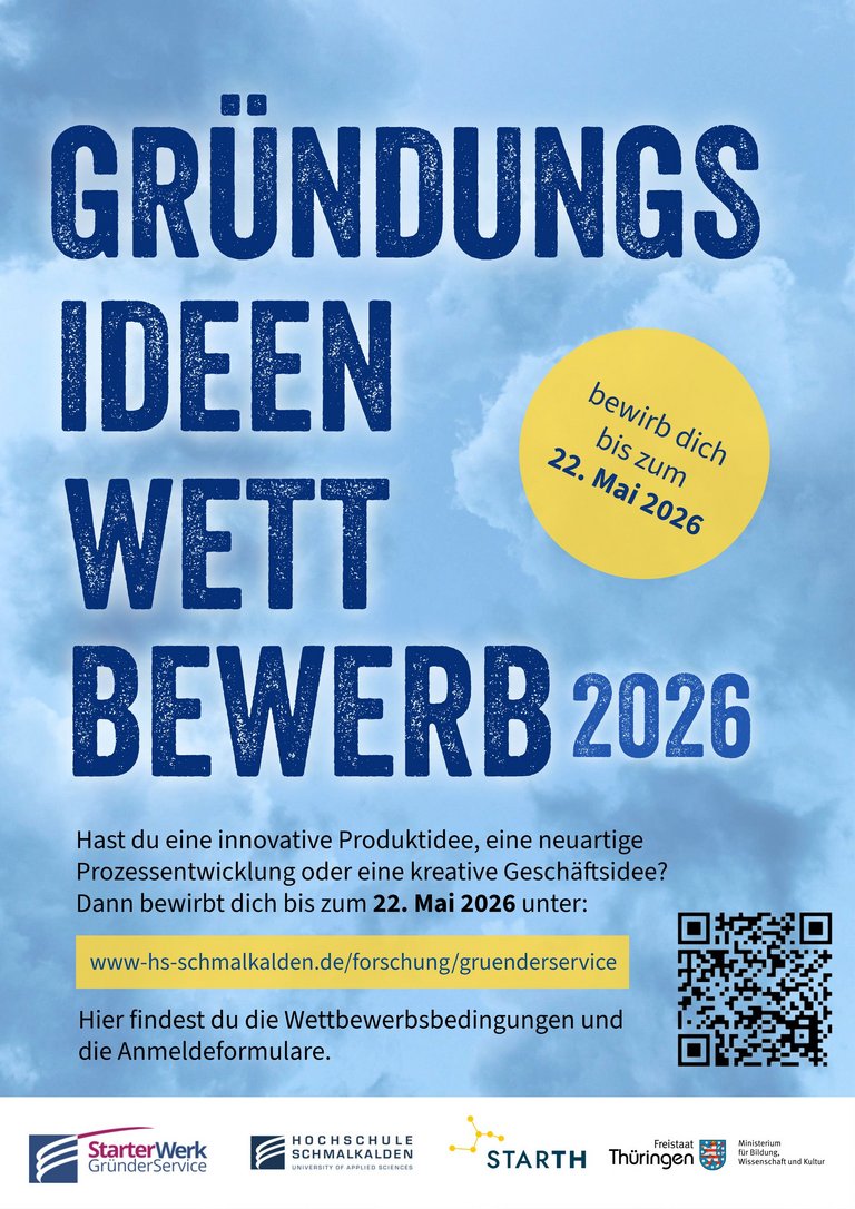 Sie haben eine Geschäftsidee, ein technisches Konzept oder eine Vision, die Prozesse verbessert, Innovation vorantreibt oder nachhaltige Lösungen bietet? Dann nutzen Sie die Gelegenheit und bewerben Sie sich beim Gründungsideenwettbewerb 2026 der Hochschule Schmalkalden.